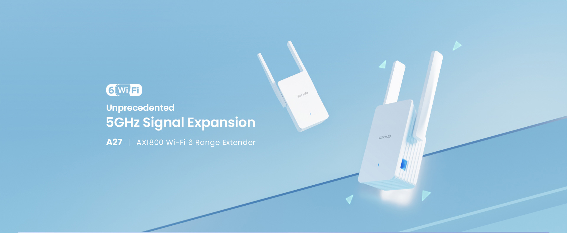 A27 is a Wi-Fi 6 range extender designed for large houses. With a 5 GHz wireless speed of up to 1201 Mbps and a 2.4 GHz wireless speed of up to 574 Mbps, it significantly increases the Wi-Fi speed compared with Wi-Fi 5 extenders. Its two 5dBi high-gain dual-band antennas can greatly increase Wi-Fi coverage. A27 features the Wi-Fi+ function, which can better build up a whole-home mesh network with Tenda Wi-Fi routers and mesh routers that support the Wi-Fi+ function as well. A27 also supports an automatic pop-up setting page and is equipped with an external smart LED indicator, which can greatly improve the user’s setting experience. In addition, A27 has an external gigabit ethernet port which is used for wired connections from smart TV, PC, set-top box, PS4, and other devices, making A27 more flexible to use.