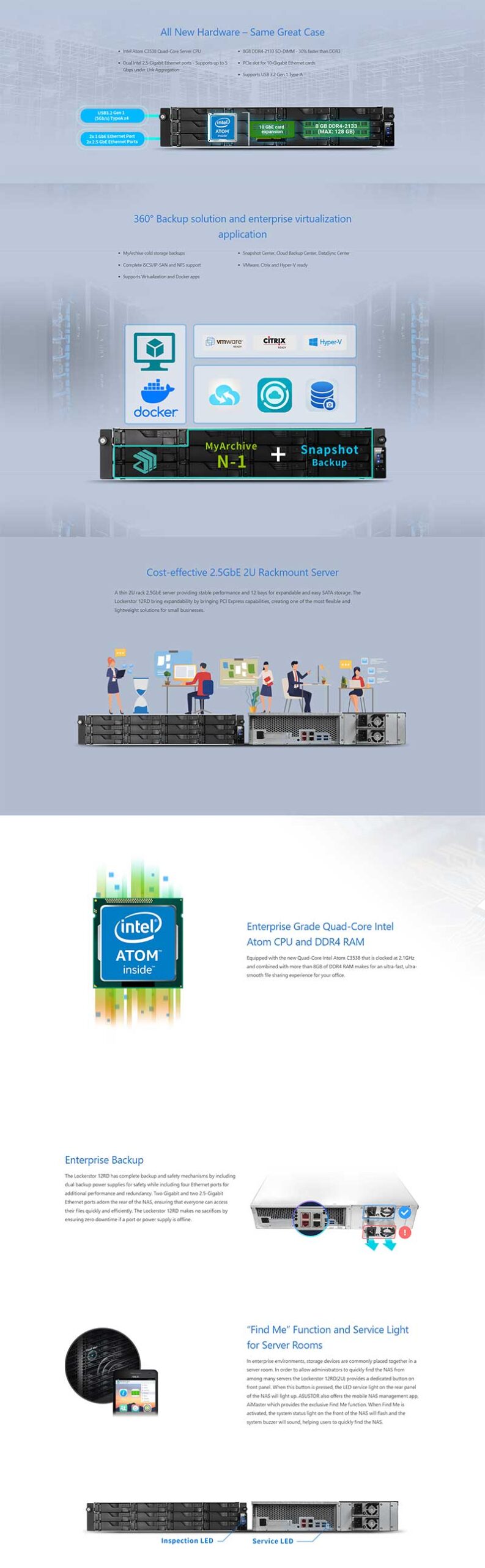12 Bay NAS,Intel ATOM C3538 Quad-Core, 8GB DDR4, GbE x 2, 2.5 GbE x 2, PCIe Gen3 (by 8 x1 – 4 link), USB 3.2 Gen 1 x 4, with lockable tray, AES-NI hardware encryption, MyArchive, SSD Caching, Snapshot, EZ connect, EZ Sync