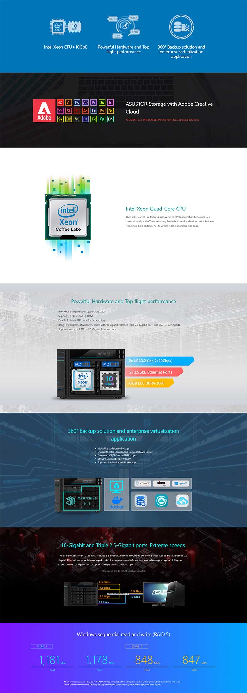 10 Bay NAS, Intel 9th Xeon E-2224, 8GB DDR4 ECC SODIMM, 2.5GbE x3, 10GbE x1, M.2 Drive Slots x 2 (2280/2260/2242 SATA/NVMe SSD), USB 3.2Gen2 Type-A x2, USB 3.2Gen1 Type-A x1,SATA, LCD Panel, with lockable tray, AES-NI hardware encryption, MyArchive, SSD Caching, Snapshot, EZ connect, EZ Sync
