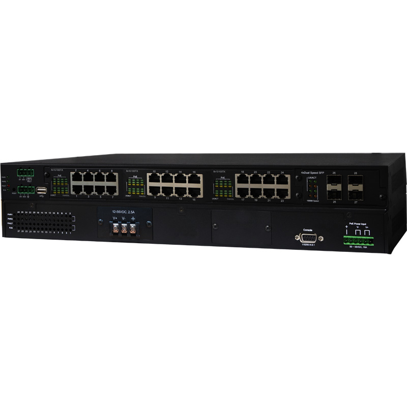 Lantech IPES-3424DSFP-2P-PT features high reliability and robustness withstanding extensive EMI/RFI phenomenon, lighting surge, inductive load switching, high ESD, high fault current, environmental vibration and shocks usually found in factory, substation, steel automation, aviation, mining and process control. It is the best solution for Automation, transportation, surveillance, Wireless backhaul, Semi-conductor factory and assembly lines.