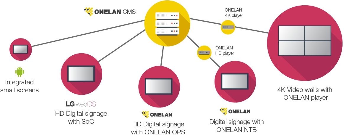 The ONELAN player software for LG webOS provides a cost effective solution without the need for a physical signage player. Powered by the ONELAN Content Management System (CMS) a range of enterprise tools are included as standard e.g. LDAP integration and sophisticated roles based access control. ONELAN’s CMS can be deployed on premise where internet connection is not available.