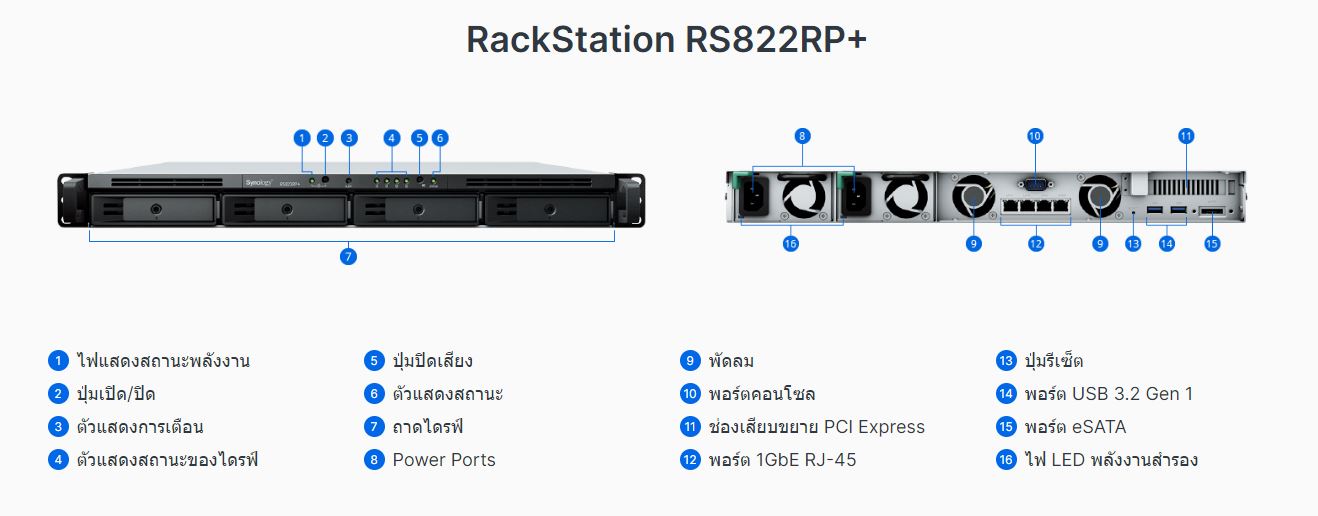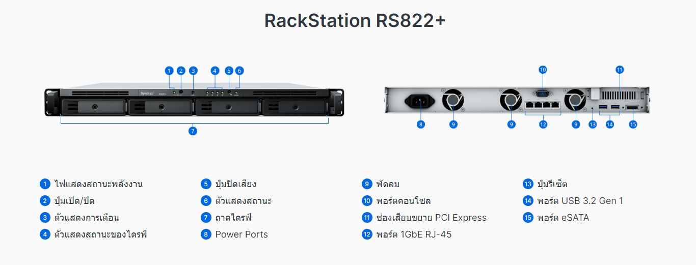Synology RackStation RS822+/RS822RP+ ขนาด 1U 4-Bay ที่กระทัดรัด พร้อมพื้นที่จัดเก็บข้อมูลและความสามารถในการปรับขยายการเชื่อมต่อ ผนวกรวมกับระบบปฏิบัติการ Synology DiskStation Manager (DSM) คือโซลูชันพื้นที่จัดเก็บข้อมูลอันทันสมัยที่เหมาะสำหรับสำนักงานสาขาและธุรกิจขนาดเล็กและขนาดกลาง